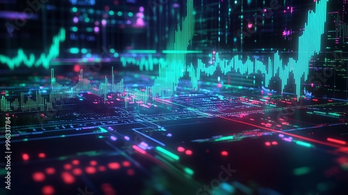 © Tackey, Fototapeta premium Abstract digital data visualization with glowing lines and graphs on a dark background.
