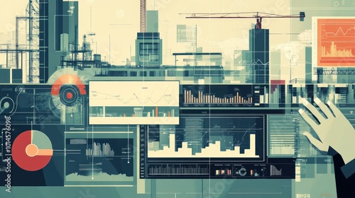 © Penatic Studio, Obraz premium Abstract digital data visualization with hand interacting with a cityscape.
