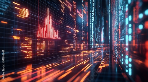 © ifoto, Obraz premium Abstract digital flow chart or structure with interconnected blocks and lines on a blurred background of an office space, representing data science technology in a business concept