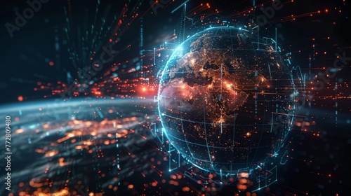 Obraz premium Abstract digital globe surrounded by orbiting data points
