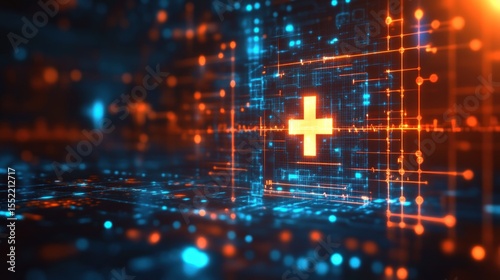 © iam, Obraz premium Abstract digital graphic design with glowing lines and a plus symbol.