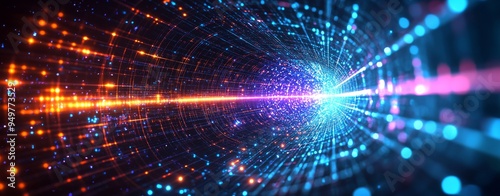 Obraz premium Abstract digital grid background with glowing light rays and stars.