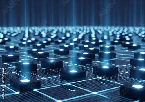 © Sleeping Carbuncle, Obraz premium Abstract Digital Grid With Glowing Blue Cubes and Data Network