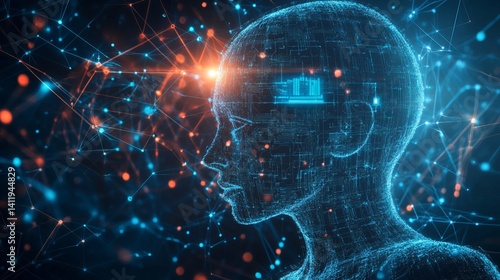 © Honey, Obraz premium Abstract digital human head network artificial intelligence concept ai data mind blue dark glow mesh
