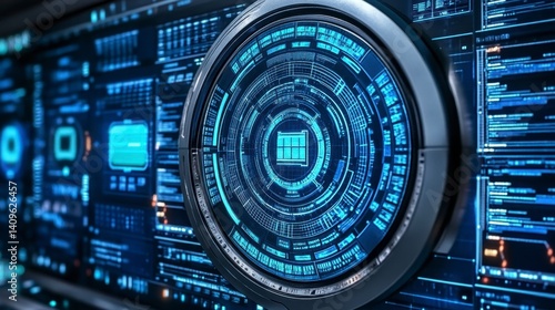 Obraz premium Abstract digital interface with glowing blue concentric circles and data...