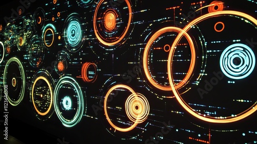 Obraz premium Abstract digital interface with glowing circles and lines.