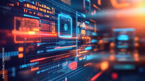 Fototapeta premium Abstract digital interface with glowing data elements and technology motifs.