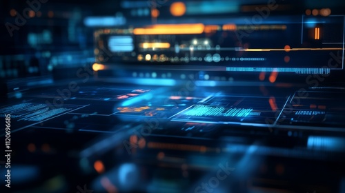 © Riska, Obraz premium Abstract digital interface with glowing lines and data.