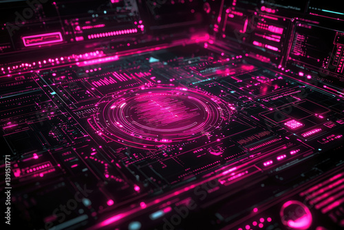 © Vibudhaart, Fototapeta premium Abstract digital interface with glowing pink lines and circular elements, representing futuristic technology and data processing.