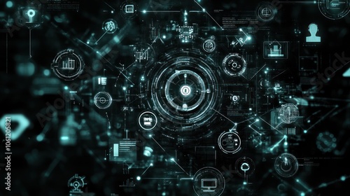 Obraz premium Abstract digital interface with interconnected data and technology symbols.