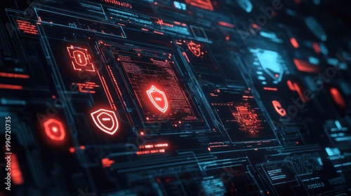 © BerkahStock, Fototapeta premium Abstract digital interface with security symbols and data elements in red and blue tones.