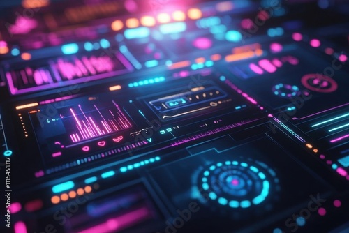Obraz premium Abstract digital interface with vibrant colors and data visualizations.