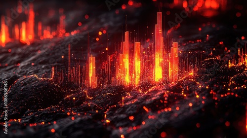 Naklejka premium Abstract digital landscape featuring glowing red and orange spikes, depicting...
