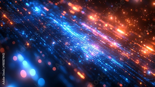 © A.Rod, Fototapeta premium Abstract Digital Landscape of Glittering Lines and Particles with Blue and Orange Lights