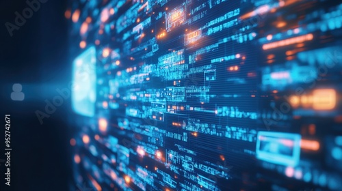 Obraz premium Abstract digital landscape with bright data streams and glowing binary code,...