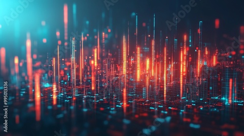 © Tackey, Fototapeta premium Abstract digital landscape with colorful glowing lines and particles in vibrant hues on a dark background.