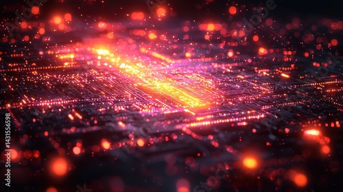 Fototapeta premium Abstract digital landscape with glowing circuits and particles in vibrant colors
