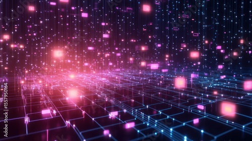 Obraz premium Abstract digital landscape with glowing neon cubes and floating data blocks...