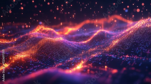 © Riska, Obraz premium Abstract digital landscape with glowing particles and waves.