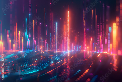 Naklejka premium Abstract digital landscape with vertical glowing lights in red, blue, and pink hues, creating a futuristic and dynamic visual. Perfect for technology, data visualization, and digital art projects with