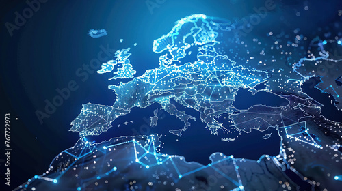 © Palung, Fototapeta premium Abstract digital map of Western Europe, concept of European global network and connectivity, data transfer and cyber technology, information exchange and telecommunication. Digital maps for business