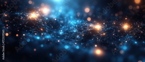 Fototapeta premium Abstract Digital Network: A mesmerizing visualization of interconnected nodes and glowing particles in a deep blue and orange hue, evoking concepts of connectivity and data flow.