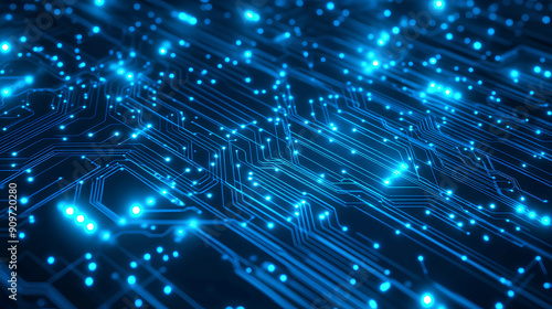 Naklejka premium Abstract digital network circuit board background banner with glowing light and connecting data dots in blue and black colors. Big data technology concept