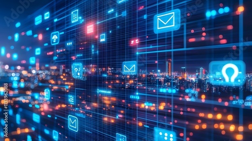 © Santri, Fototapeta premium Abstract digital network data flow over city skyline at night.