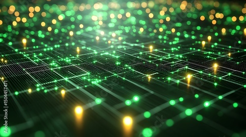 Obraz premium Abstract digital network depicted with glowing nodes and connecting lines forming a grid pattern on a dark background, with warm and cool light accents