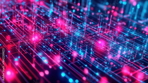 © Rizky, Obraz premium Abstract digital network of glowing lines and points in vibrant pink and blue