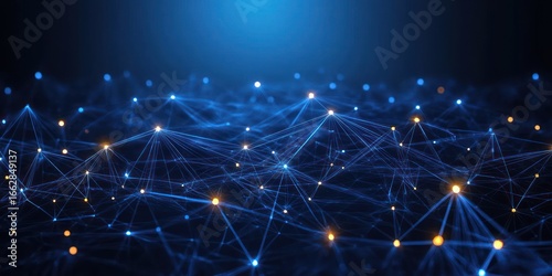 Fototapeta premium Abstract digital network visualization with glowing interconnected nodes and lines on dark blue background representing data connections and technology