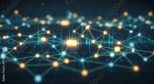 © Poc09, Obraz premium Abstract digital network with glowing interconnected nodes and lines representing data flow and technological connections.