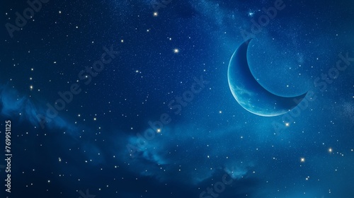 Fototapeta premium Abstract digital Ramadan moon on night starry sky background, Ramadan moon background, Islamic background, Islamic moon in the sky background, moon in the sky background