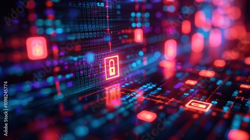 Obraz premium Abstract digital representation of cybersecurity with locks and binary code.