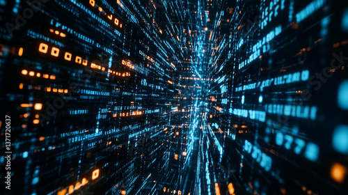 © Shahazadi, Fototapeta premium Abstract digital space with blue and orange glowing data streams and binary code elements flowing