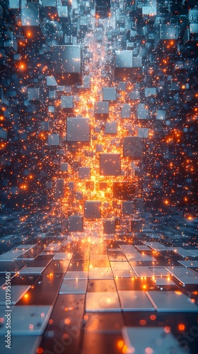 © Luminora Studio, Obraz premium Abstract digital space with floating cubes on a white gradient background featuring a central cluster emitting orange light with blue and red shadows