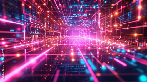 Fototapeta premium Abstract digital technology background featuring interconnected grids of neon...