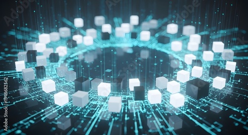 © Lucianastudio, Fototapeta premium Abstract digital technology background with glowing data cubes and circuit lines