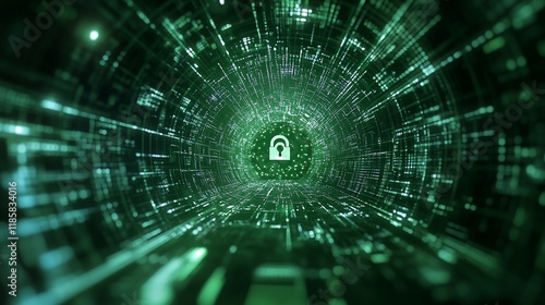 Obraz premium Abstract digital tunnel with a glowing padlock at the center, representing...