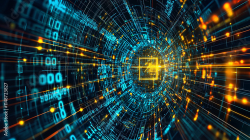Fototapeta premium Abstract digital tunnel with glowing lines and numbers..