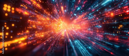 Naklejka premium Abstract digital tunnel with glowing lines and particles in red and blue hues.