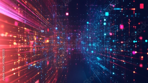 © Raffaza, Fototapeta premium Abstract digital tunnel with glowing particles and lines.