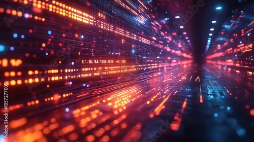 Obraz premium Abstract digital tunnel with vibrant data streams and lights.