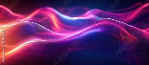 © Rgrd, Obraz premium Abstract digital wave landscape with flowing, glowing mesh in vibrant pink, purple, and orange hues creating a futuristic and dynamic visual effect