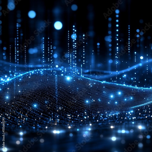 © Ilja, Obraz premium Abstract Digital Wave of Binary Code Particles on Dark Background, Futuristic Technology Concept