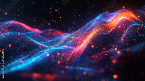 © Rabil, Fototapeta premium Abstract digital wave with colorful particles on a dark background. The wave has smooth, wavy curves, creating a futuristic and technological aesthetic.