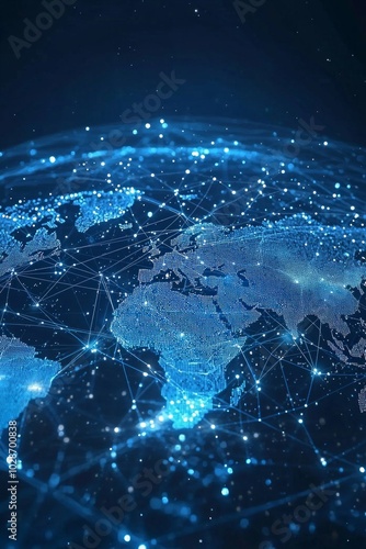 Fototapeta premium Abstract digital world map with global network connections and data transfer, technology background concept. Blue glowing lines on a dark blue background.