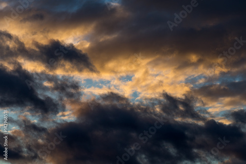 © DedMityay, Obraz premium Abstract dramatic sky background with fluffy sunset clouds, cloudscape pattern, copy space