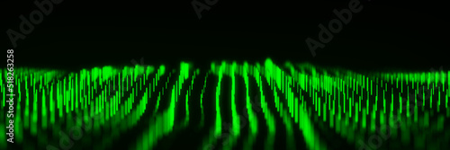 © Vitalii, Fototapeta premium Abstract dynamic wave flow of vertical green glow lines on a dark background. Digital wave background concept. Big data visualization. 3D rendering.