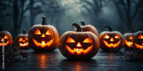 Fototapeta premium abstract eerie glowing red lined up Halloween pumpkin on misty background,...